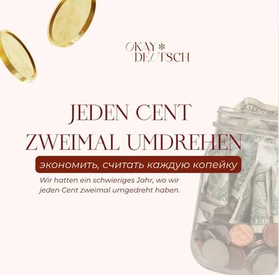 💸переворачивать каждый цент дважды: что это значит? принесла для вас офигенное выражение, на которое наткнулась во время подготовки к Sprachklub 🤩Jeden Cent zweimal ùmdrehen — сильно экономить, сч