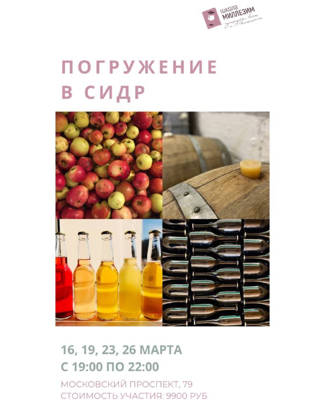 Дарим место на курсе «Погружение в сидр» На первом глубоком и насыщенном курсе о сидре в винной школе вы узнаете все особенности этого напитка с характером, историей и удивительным разнообразием сти