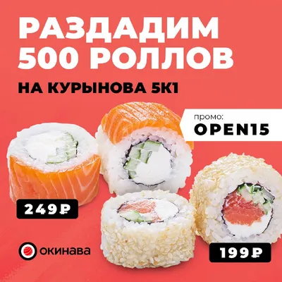 Запускаем день роллов на ул. Курынова д.5к1! 🔥 Только здесь и только сегодня мы раздаем роллы по супер-цене: Ролл "Филадельфия с огурцом" за 249₽; Ролл "Сливочный лосось" за 199₽. Как забрать: 1.