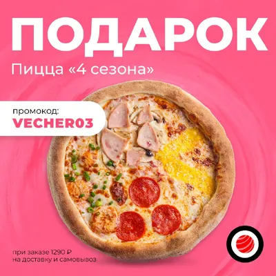 Дарим пиццу "4 сезона" только сегодня с 19:00 до 22:00! по промокоду 👉🏻 VECHER03 Пицца "4 сезона" в подарок по промокоду VECHER03 на доставку и самовывоз от 1290 руб! *Промокод не суммируется с д