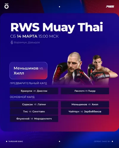 Лови кард турнира по муайтай RWS от 14 марта 🔥 В главном бою предстоящего турнира на легендарной арене Раджадамнерн сразится впервые в лиге российский боец, выступавший в Glory и ONE – Дмитрий Меньш
