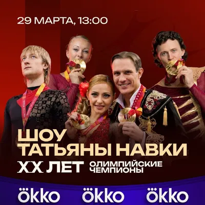 ⚡️ Okko эксклюзивно покажет в прямом эфире ледовое шоу Татьяны Навки «Олимпийские чемпионы. XX лет», посвящённое 20-летию триумфа российских фигуристов на зимних Олимпийских играх 2006 года в Турине!