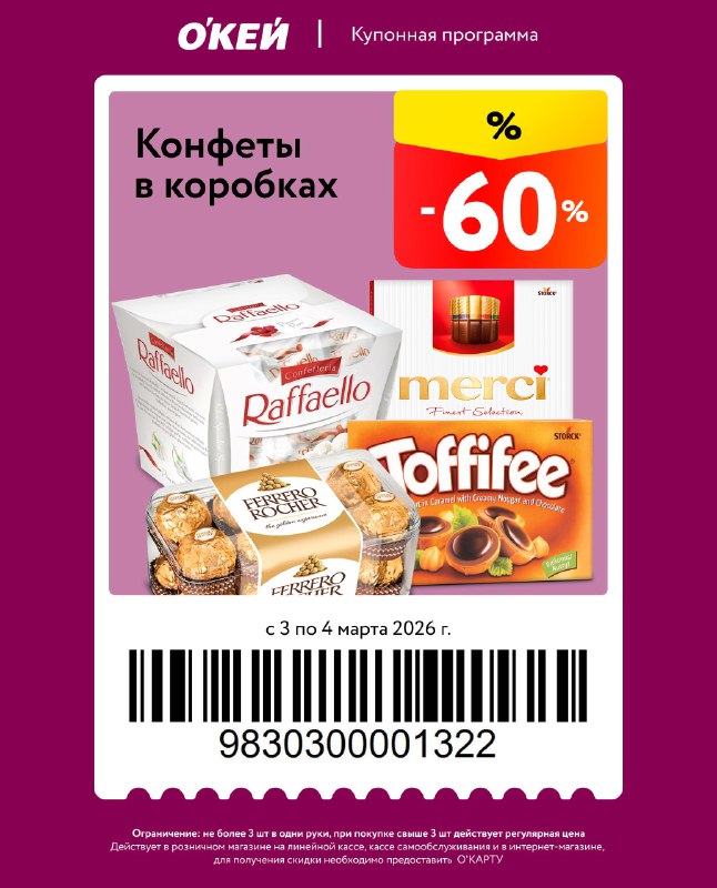 Маленький лайфхак перед 8 Марта: цветы — это хорошо. Цветы + коробка хороших конфет — уже отлично 😌 Сейчас действует купон на –60% на кондитерские изделия в коробках. Самое время выбрать сладкий арг