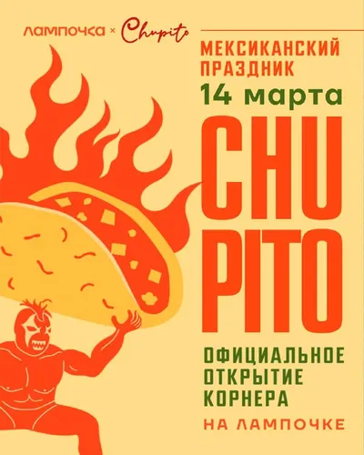 🌮 Окей, на Лампочке - официальное открытие корнера Chupito Прикольные матстер-классы и акции, конкурсы , розыгрыши и танцы - неплохой повод выйти из дома в субботу. 🧿14 марта 📍11:00 📍Лампочка