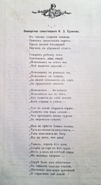 Посмертное стихотвореніе Ивана Захаровича Сурикова Въ тихомъ сумракѣ лампада Свѣтомъ трепетным горитъ, Предъ иконой бѣлокурый Внучекъ съ дѣдушкой стоитъ. Говоритъ ребенку тихо, Наклоняясь, дѣдъ сѣдо