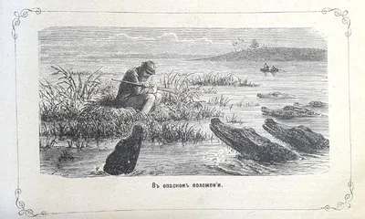 Въ опасномъ положеніи Изображенный на нашемъ рисункѣ эпизодъ отнюдь не придуманъ, а дѣйствительно имѣлъ мѣсто въ Портъ-Наталѣ, англійской колоніи въ Южной Африкѣ. Герой, страстный охотникъ, отправилс