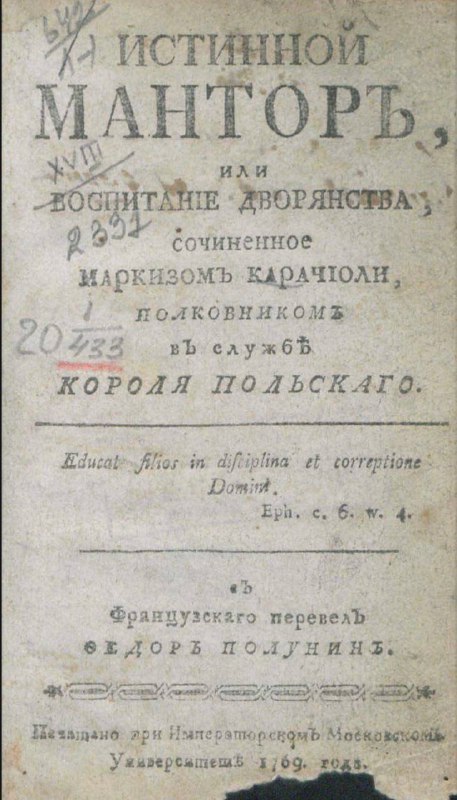 ➖Истинный мантор, или Воспитание дворянства Л.А. Караччоли /1742год То, что этот документ внесён в реестр книжных памятников, говорит о его исключительной ценности. «Истинное воспитание есть не что