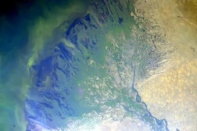 Один из самых ярких снимков, которые мне удалось сделать за все три космические экспедиции – это определённо дельта Волги😍 Этот удивительный кадр похож на цветок, распустившийся среди бескрайних пес