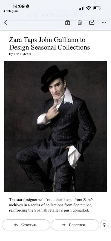 Galliano будет приглашённым дизайнером для сезонных коллекций Zara. Причём не просто коллаборации-капсулы, а серии коллекций, которые: • будут переосмыслять архив Zara (“re-author items from Zara’s a