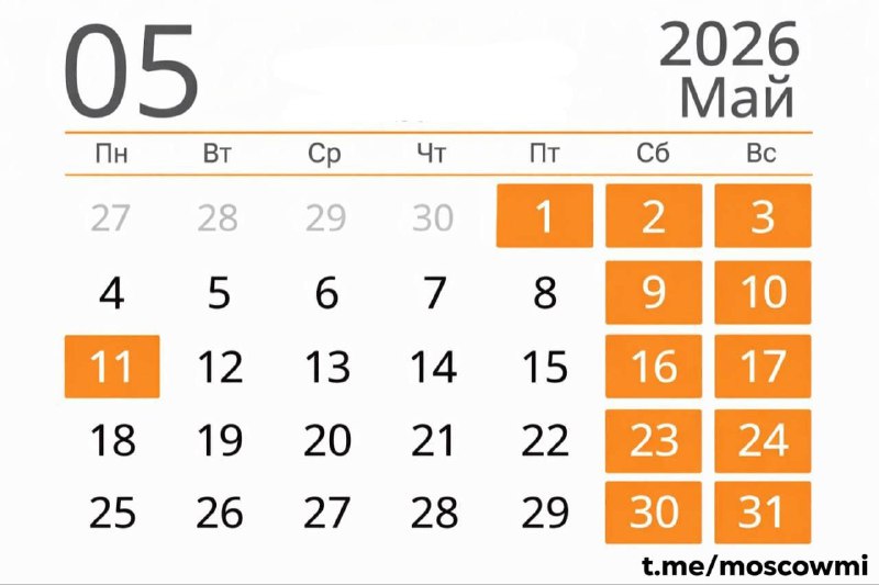 😢 Лишь 2 дополнительных выходных будут в этом году на майских праздниках — 1 и 11 мая.