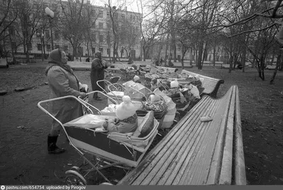 Сегодня мы с вами переместимся в Москву 1969 года. Начинаем прогулку со Страстного бульвара. В сквере женщины и множество колясок. Судя по всему, эти тётушки смотрели да детьми, пока их мамам надо был