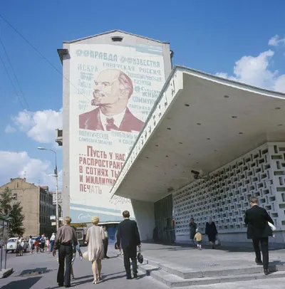 Завершим прогулку по Москве 1969 года около метро «Октябрьская» Калужско-Рижской линии. Очень интересный наземный вестибюль. Тогда это было редкостью. Ну и реклама советских печатных изданий на доме р