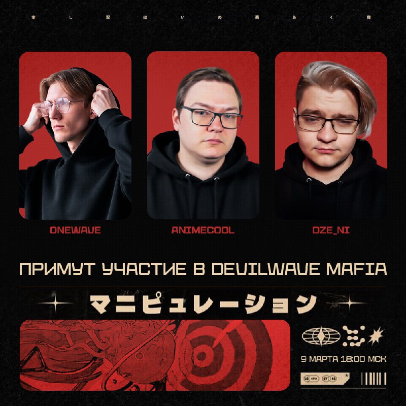 DEVILWAVE MAFIA — 9 МАРТА 18:00 (МСК) ➡️ Участники: Onewave | Animecool | Dze Ni | Tulen Arkadiy | Margoggi | Aikomori | Dyda | J4kuten | Hamster | 9ixi6 | ishie_j | Yunnost Демонические косплеи, бе