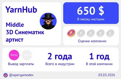 Зарплата 650$ у Middle 3D Синематик артист в YarnHub В какой ты стране? Армения Круг твоих обязанностей? 3D анимация ( в осносном работа с мокапом ), сетап сцены, растановка света, рендер Сколько