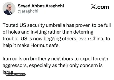 Глава МИД Ирана Аббас Аракчи: Иран просит своих соседних братьев изгнать иностранных захватчиков с их территорий Защитный зонтик, который США годами рекламировали, теперь оказался полон дыр; зонтик,