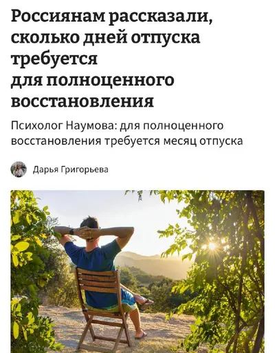 Чтобы полностью восстановиться от работы, человеку нужен МЕСЯЦ отпуска. Специалисты говорят, что только за такой срок тело и психика пройдут полноценную перезагрузку. Первую неделю отпускники часто п