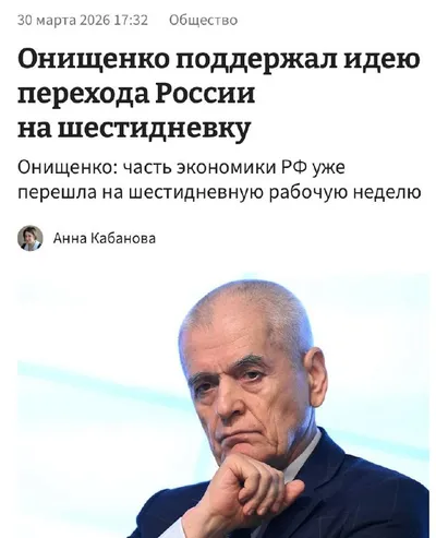 Шестидневку в России надо закреплять на законодательном уровне, заявил Геннадий Онищенко. Он полностью поддержал предложение Олега Дерипаски, который предложил россиянам работать по 12 часов шесть дне