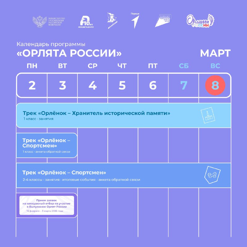 Что ждёт Орлят на этой неделе? 🏃 На этой неделе для 1 классов: 🔹 стартует трек «Орлёнок – Хранитель исторической памяти», который продлится до 20 марта; 🔹 до 23:59 по мск 3 марта есть возможность