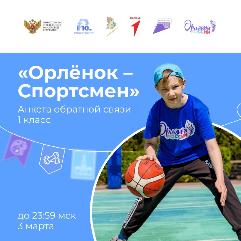 Последний день, успевайте!🚨 Сегодня до 23:59 по мск есть возможность заполнить анкету обратной связи о реализации трека «Орлёнок – Спортсмен» для учащихся 1 класса. Ее можно найти в личном кабинете