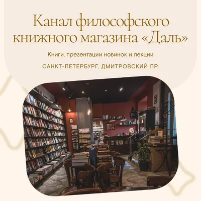 Канал философского книжного «Даль» с ежедневными анонсами книжных новинок и лекций → Петербург, Дмитровский переулок, д. 4, вход со стороны сквера, 11:00—21:00. На канале публикуются книги по соврем