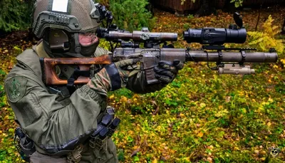 Сотрудники спецподразделения «А» белорусского КГБ с снайперской винтовкой ВСС «Винторез», оснащенной оптическим прицелом ПСО-1 М2-1 и тепловизионным прицелом Дедал-Т2.360, установленным на планке пика