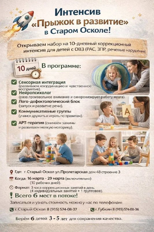 Интенсив «Прыжок в развитие» в Старом Осколе! 🎉 Мамы и папы, мы открываем набор на 10-дневный коррекционный интенсив для детей с ОВЗ (РАС, ЗПР, речевые нарушения). 📍 Где: г. Старый Оскол ул. Проле