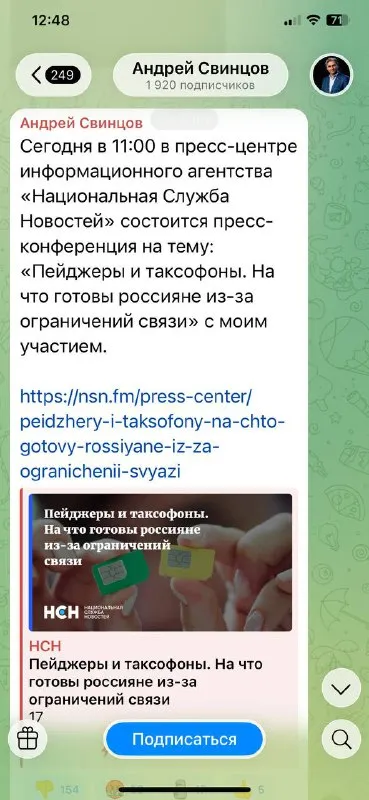 Жалоба в Госдуму Прошу рассмотреть моральный облик депутата Свинцова, который постит в ТГ объявление о пресс-конференции на тему «На что готовы россияне из-за ограничений связи». Известно со слов деп