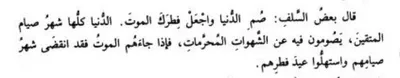 Постись от этой жизни и сделай своим разговением смерть. Вся эта мирская жизнь есть месяц поста для остерегающихся наказания Аллаха. Они постятся в ней, проявляя терпение перед запретными желаниями. К