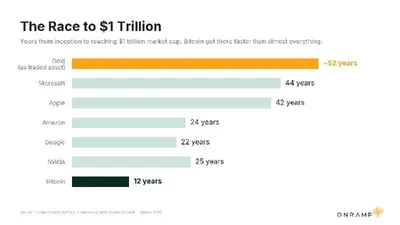 📊 Сколько времени понадобилось различным активам и компаниям, чтобы достичь капитализации в $1 трлн 🔴Золото (как торгуемый актив) – 52 года 🔴Microsoft — 44 года 🔴Apple — 42 года 🔴Amazon — 24 го