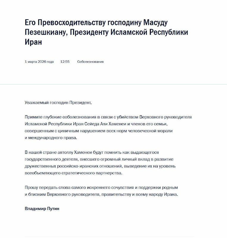 ⚡️ Владимир Путин выразил соболезнования Масуду Пезешкиану в связи с убийством верховного лидера Ирана Али Хаменеи. 🙏 – соболезнуем! От Первого Лица | Мы в МАХ
