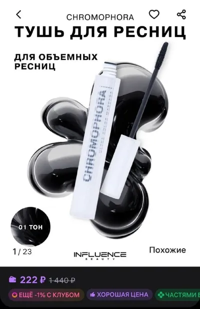 Тушь для ресниц черная объем и удлинение INFLUENCE BEAUTY CHROMOPHORA яркая за 222 рубля WB https://www.wildberries.ru/catalog/221461360/detail.aspx?size=351816747