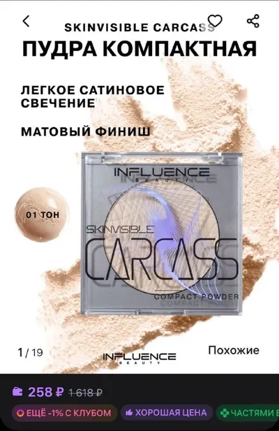Пудра для лица матирующая компактная INFLUENCE BEAUTY за 258 рублей WB 1. Тон 01 https://www.wildberries.ru/catalog/58107310/detail.aspx?size=104957160 2. Тон 02 https://www.wildberries.ru/catalog/