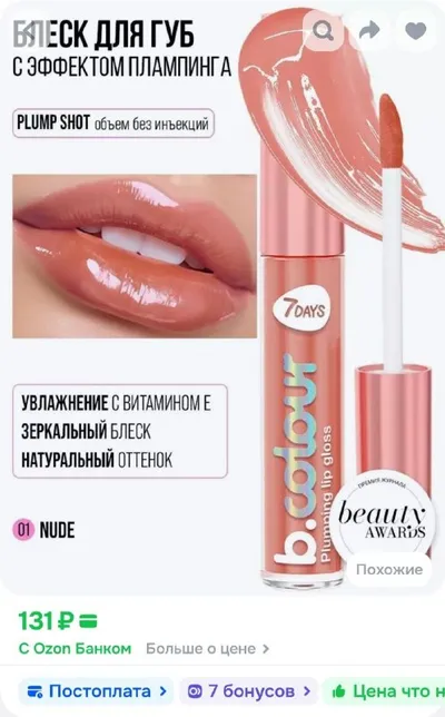 Блеск для губ 7DAYS прозрачный увлажняющий c эффектом увеличения, бальзам плампер с гиалуроновой кислотой B.COLOUR 01 Nude за 131 рубль OZON https://ozon.ru/t/lwxZLoa