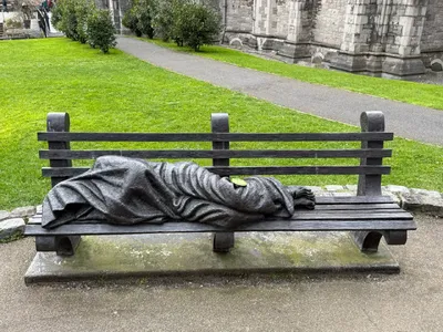 Памятник бомжу - бывает и такое В Дублине в одном из городских скверов установлен памятник бездомному, который прилег на скамейке. Официально композиция называется "Бездомный Иисус", и на его ногах