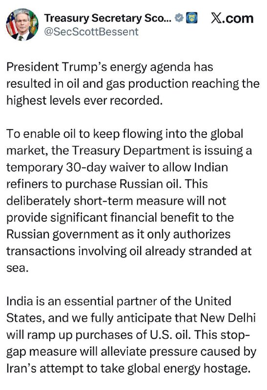 🛢 Трамп разрешил Индии закупку российской нефти, заявил глава Минфина США Бессент 📰 Министерство финансов США вводит временное 30-дневное разрешение, позволяющее индийским нефтеперерабатывающим зав