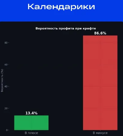 🗓Есть ли смысл крафтить календарики? Для начала возьмём стоимость крафта при 4🎁 по 🎁5.98 = 🎁23.92 Ожидание 🎁20.37. Вероятность окупится - 13.4%. Вероятность минусов - 86.6% По редкостям: 🟠