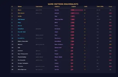 🎁 Топ-китов собирающих узоры Топ узоров: 1. @denis33371 — 458 Candle 2. @wild_s_side — 317 Anchor 3. Surfer — 167 Star 4. Gift Keeper — 164 Shooting Star 100% профиля в одном узоре: 1. @wild_s