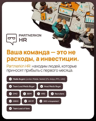 🔥Partnerkin HR — кадровое агентство, которое специализируется на поиске топовых кадров для IT, Digital и Affiliate проектов. Мы берем на себя полный цикл найма: от хантинга до онбординга и HR-аудитов