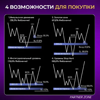#Обучение 🔵 4 возможности для покупки на откате ⠀ #Рынок почти никогда не движется по прямой. Даже в сильном тренде #цена регулярно делает откаты, и именно в эти моменты у трейдера появляются самые