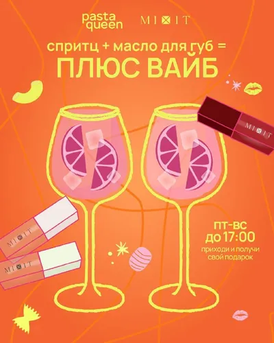 Солнце за окном — время для спритца! ☀️🥂 Заказывай мой Спритц Личи с пятницы по воскресенье до 17:00 и получай в подарок масло для губ от MIXIT. ✨ Готовимся к лету и теплому сезону красиво. Прихо