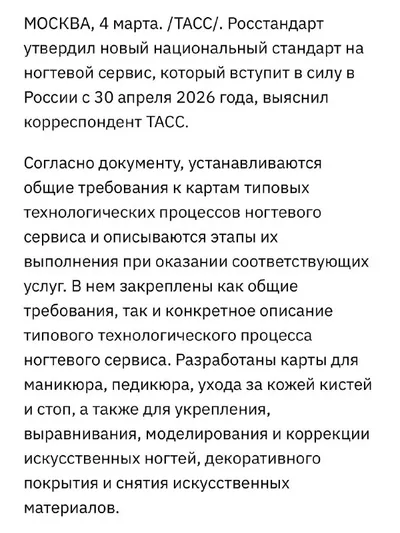 С конца апреля в России появится новый ГОСТ на ногтевой сервис. С 30 апреля вводятся минимальные стандарты по длительности процедур: • классический маникюр 45–60 минут • аппаратный маникюр 40–70 м