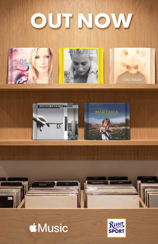 Ritter Sport x Apple Music — отличный пример «retail‑first» коллаборации, где шоколад становится медиа-носителем: квадратная плитка = формат обложки альбома, а QR‑код на упаковке превращает импульсную