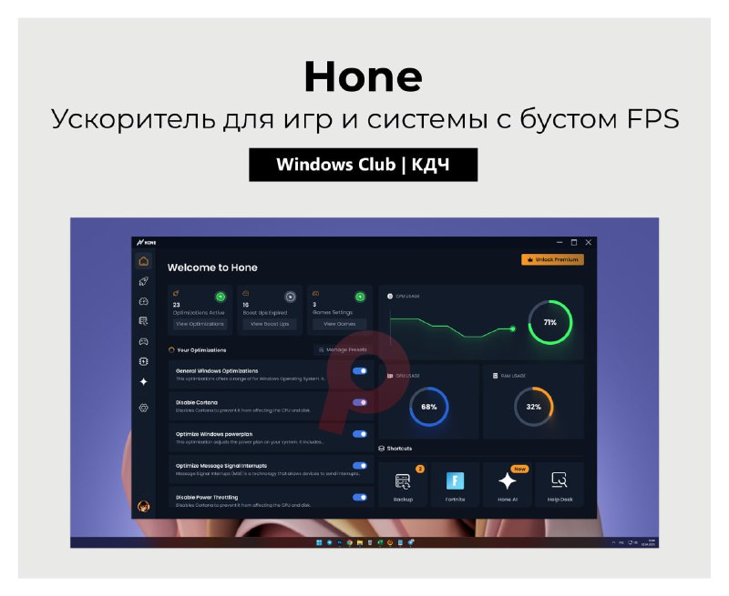 Ускоритель для игр и системы с бустом FPS Утилита Hone повышает производительность в играх и приложениях, снижает задержки ввода и оптимизирует сетевые настройки. Работает на любых ПК с Windows 10 и