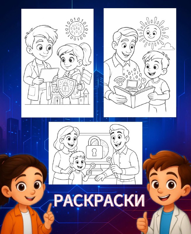 ❤️ Раскраски «Цифровой щит» Набор чёрно-белых раскрасок для начальной школы и детского сада по теме цифровой безопасности. Дети в образе юных защитников, цифровые щиты, замки, пароли, безопасный инте