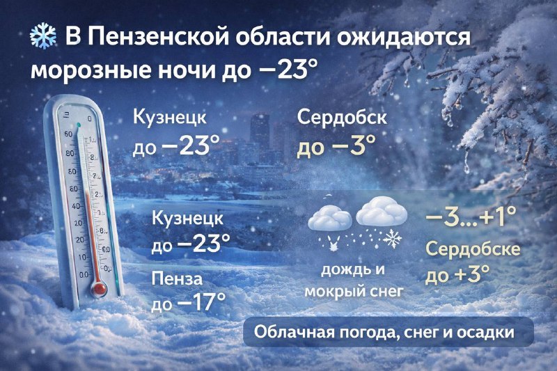 🥶 Ночные морозы до −23° ожидаются в Пензенской области 10 марта в регионе ожидается довольно контрастная погода. Ночью температура резко опустится: — в Кузнецке до −23° — в Пензе до −17° Днём стан