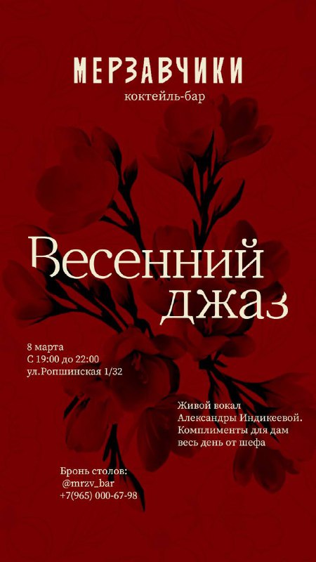 Джаз, живые цветы и весеннее настроение в «Мерзавчиках» 🌸 Прекрасные дамы, бронируем столики на 8 марта! В честь этого красивого праздника бар «Мерзавчики» пригласил певицу Александру Индикееву. Она