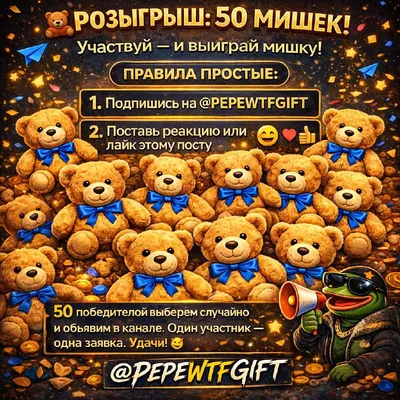 🧸РОЗЫГРЫШ: 50 МИШЕК! Участвуй — и выиграй мишку! Правила простые: 1. Подпишись на @PEPEWTFGIFT 2. Поставь реакцию или лайк этому посту 50 победителей выберем случайно и объявим в канале. Один уч