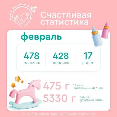 😍 Счастливая статистика за февраль В этом месяце у нас родились: ❤️ 428 девочек 💙 478 мальчиков ❤️❤️ Итого — 906 малышей, из них 17 пар двойняшек. *️⃣ Самый маленький малыш — 475 г *️⃣ Самый крупны