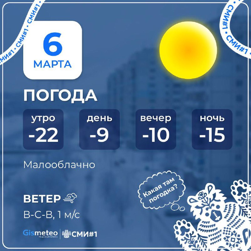 Погода сегодня в Перми ❄️ Малооблачно, небольшой снег 🌡 Температура днём -9°, по ощущениям как -15° 🧤 Слабый ветер 1 м/с, порывы до 3 м/с