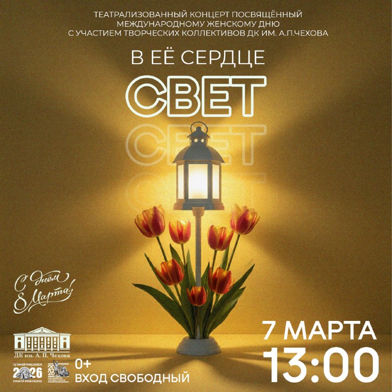 Концерт «В ее сердце свет» ⏰7 марта (сб), в 13:00 📍ДК им. А.П. Чехова, ул. Репина, 20 💵Вход свободный Гостей приглашают на театрализованный концерт, посвященный Международному женскому дню с участ
